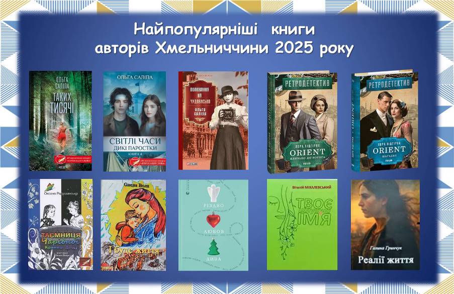 📖    – добірку художніх видань авторів Хмельниччини, виданих 2025 року, зокрема, Ольги Саліпи, Лори Підгірної, Віталія Міхалевського, Галини Гринчук та ін. – абонемент худ. літ., 4-й пов.;