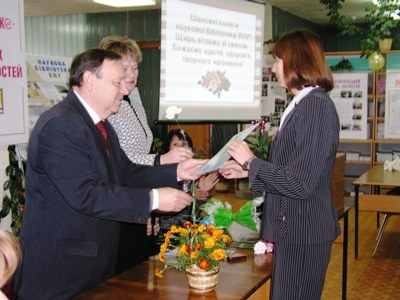 Вже 13-й рік поспіль наша країна відзначає Всеукраїнський день бібліотек, святкування якого в Україні у цьому році відбувалося у загальнонаціональному масштабі під гаслом "Бібліотек@ – світ нових можливостей". День бібліотек — це свято і читачів бібліотеки, і відданих її друзів, і дарителів книг, усіх, хто підтиримує її добрим словом та добрими справами. Працівників наукової бібліотеки вітали ректор університету, професор, д.т.н. Скиба М.Є., проректор з науково-педагогічної роботи, професор, д.е.н. Войнаренко М.П., проректор з організації діяльності, контролю та перспективного розвитку ХНУ, професор, д.т.н. Шинкарук О.М., Голова вільної профспілки університету Савюк М.А., головний спеціаліст управління культури, туризму і курортів ОДА Чабан К.А., читачі бібліотеки. Звучали слова подяки колективу книгозбірні за їх натхнену працю, за високий професіоналізм та постійний інноваційний пошук. Ректорат університету подарував бібліотеці 2 потужних комп'ютери. Кращі працівники книгозбірні за вагомий внесок в розвиток наукової бібліотеки отримали Почесні грамоти та премії. Гості побажали присутнім нових трудових звершень, невичерпної енергії, допитливих і добрих серцем читачів. Родзинкою свята стала презентація нового навчального посібника проректора з науково-педагогічної роботи, професора, д.е.н. Войнаренка М.П. "Міжнародні стандарти фінансової звітності аудиту". Перші сигнальні екзампляри книги автор подарував книгозбірні. У вестибюлі бібліотеки, на великому аркуші паперу вдячні читачі залишили свої відгуки і враження про її роботу; серед них такі: "Дякуємо працівникам бібліотеки за ввічливість та гарне ставлення до студентів. Зі святом Вас! Щастя, успіхів, творчого натхнення. З повагою, МІН-09-2". "Шановні працівники бібліотеки! Вітаємо Вас з професійним святом! Дякуємо вам за таку потрібну і натхненну працю. Студенти гр. ФУМ-07-2". В рамках Всеукраїнського дня бібліотек у науковій бібліотеці пройшла акція "День пробачення".