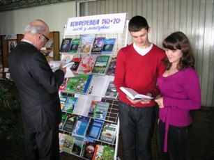Глобальні екологічні проблеми з розряду науково -теоретичних перейшли у пріоритети національної та міжнародної політики. 20-22 червня 2012 року в м. Ріо-де Жанейро відбудеться конференція ООН зі збалансованого розвитку. Відповідно до резолюції Генеральної Асамблеї ООН мета Конференції Ріо+20 полягає у забезпеченні нових політичних зобов'язань у сфері збалансованого розвитку, оцінці досягнутого прогресу та заповненні прогалин у процесі виконання рішень основних зустрічей на високому рівні зі збалансованого розвитку, а також у розв'язанні нових проблем. З ініціативи Хмельницького обласного осередку Всеукраїнської екологічної ліги, кафедри екології ХНУ в науковій бібліотеці університету відбулося засідання круглого столу "Україна на шляху до Конференції ООН зі збалансованого розвитку Ріо+20. Екологічні проблеми Хмельниччини в контексті глобальних екологічних викликів". В засіданні взяли участь провідні фахівці з охорони довкілля: Міронова Н.Г.- к.т.н., доцент кафедри екології, голова Хмельницького обласного осередку Всеукраїнської екологічної ліги, Ліщук О.І. - начальник відділу інструментально-лабораторного контролю Державної екологічної інспекції в Хмельницькій області, Куцка І.В. - начальник відділу екології Управління з питань екології та контролю за благоустроєм міста та ін. В доповідях учасників підкреслювалось, що екологічна безпека Подільського регіону має розглядатись як одне з найвідповідальніших завдань сьогодення, наголошувалось на необхідності переходу від нинішньої природоруйнівної моделі до збалансованого розвитку. Кращі активісти природоохоронного руху були нагороджені грамотами Всеукраїнської екологічної ліги. В рамках заходу презентувалась виставка літератури "Конференція РІО+20 — міст в майбутнє". |