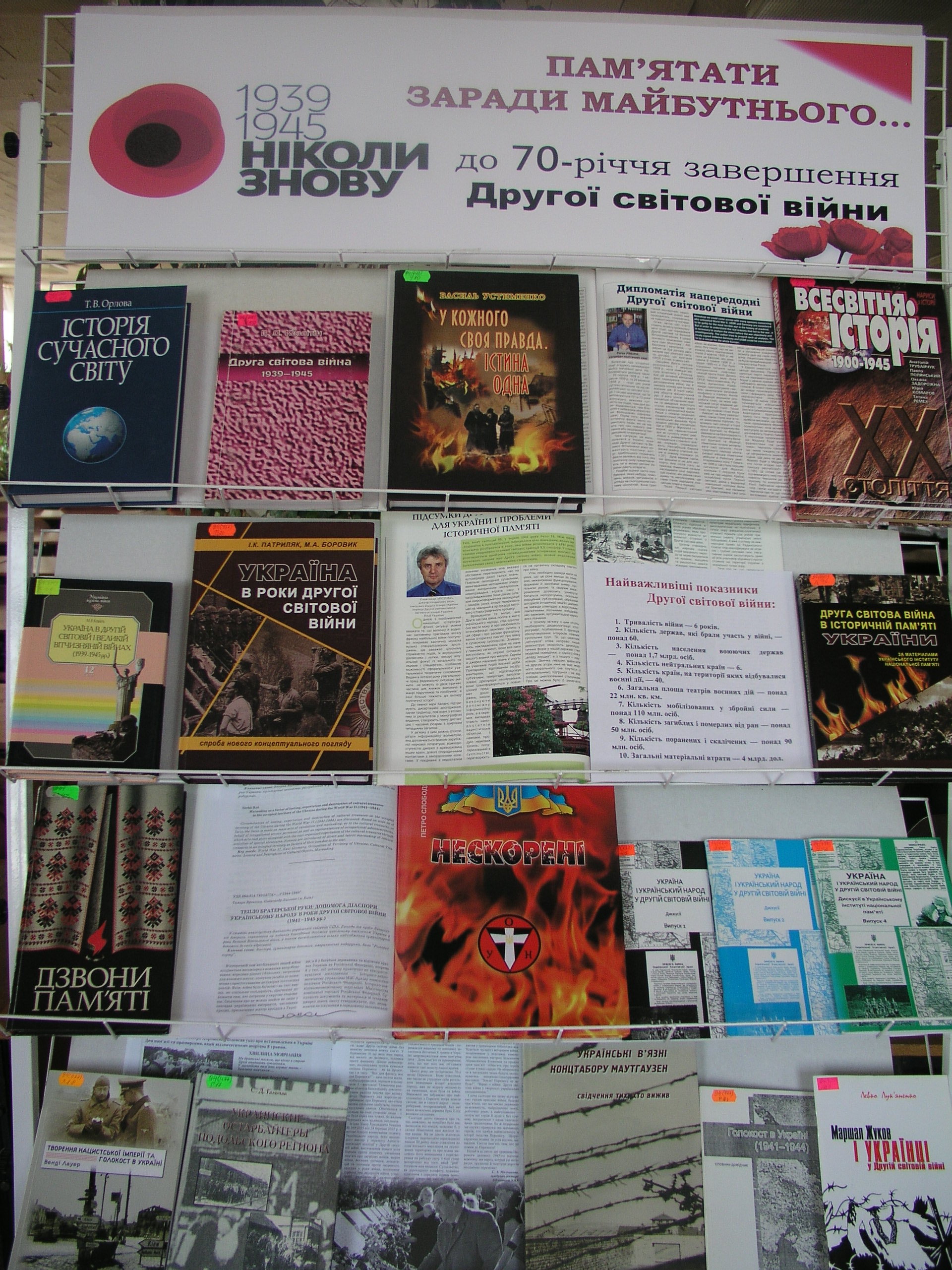 «Пам'ятати заради майбутнього...» - під такою назвою в читальному залі 7 поверху розгорнуто книжково-ілюстративну виставку, приурочену до 70-річчя завершення Другої світової війни 1939-1945 років. Видання, представлені в експозиції, розглядають причини виникнення Другої світової війни, відтворюють широку панораму головних подій від початку війни в 1939 році до капітуляції Німеччини, висвітлюють особливості таємної міжнародної дипломаті, внесок України у досягнення перемоги над нацистською Німеччиною.
