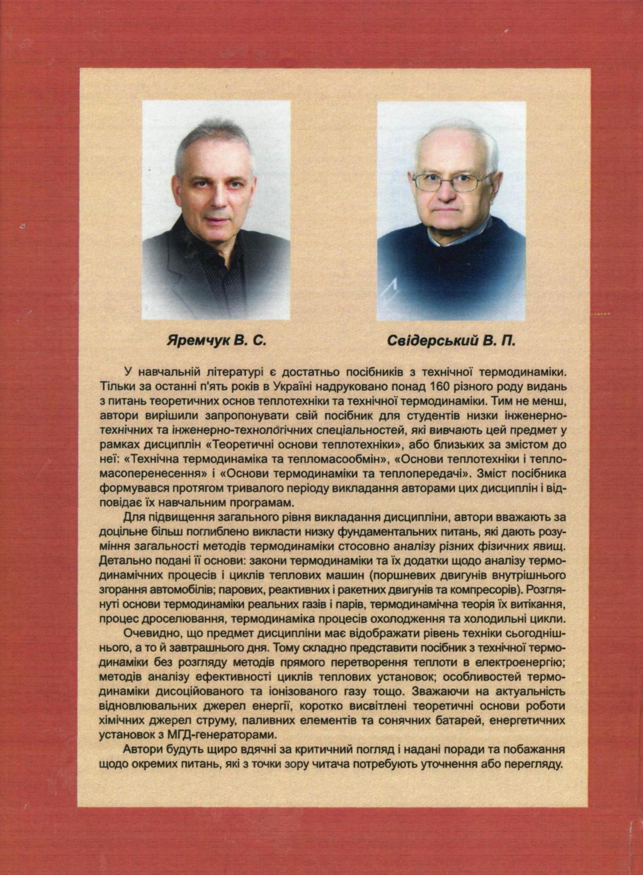 Наведені основи технічної термодинаміки. Розглянуті основні закони, термодинамічні процеси перетворення різних форм енергії; цикли, характеристичні функції і диференціальні рівняння для ідеальних та реальних робочих тіл; процеси дроселювання, витікання і нагнітання газів; відображені питання безмашинного перетворення енергії. Для студентів інженерних та інженерно-технологічних спеціальностей ЗВО III-IV рівнів акредитації. Зміст